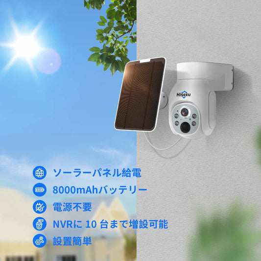 【翌日到着・400万画素・360° PTZ機能搭載・電源不要】Hiseeu ソーラーパネルカメラ セット 10インチLCD液晶モニタ一体型NVR 8000mAh 遠隔監視 防水等級ip66 AI動体検知 屋内/屋外 セキュリティ 防犯カメラ 常時録画可能 (400万画素カメラ4台+10イン液晶一体型NVR+1TBHDD内蔵)