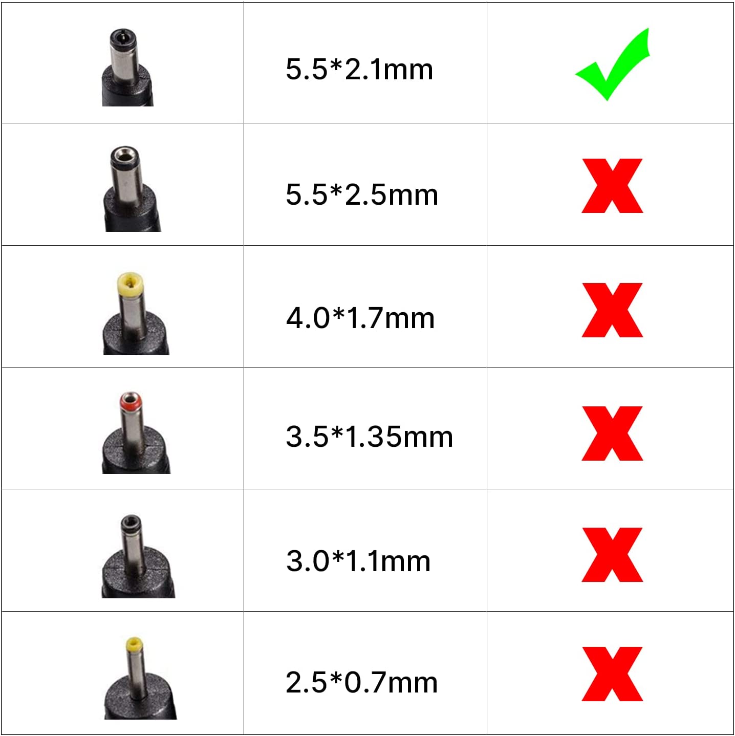 - プラグサイズ:出力プラグ外径5.5mm、内径2.1mmで、プラグサイズが5.5mm×2.1mmである電器に共用です、ご使用の前、接続機器のプラグサイズをご確認ください。