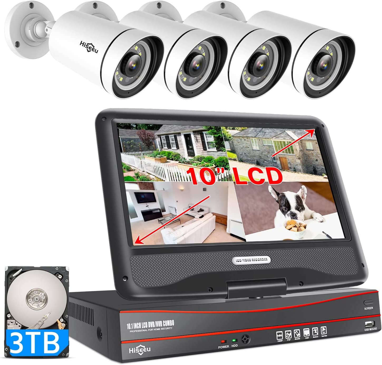 【500万画素・POE有線接続】Hiseeu防犯カメラ poe給電 屋外 有線 監視カメラ 4台セット 10インチモニター付き 500万画素POEカメラ IP66防水 センサー発光 双方向音声 屋内外対応 暗視撮影 動体検知 常時録画 防犯カメラ セット スマホ/パソコン遠隔監視 アプリ通知 監視カメラ・録画機セット (カメラ4台+モニター付きNVR本体+3TB HDD)